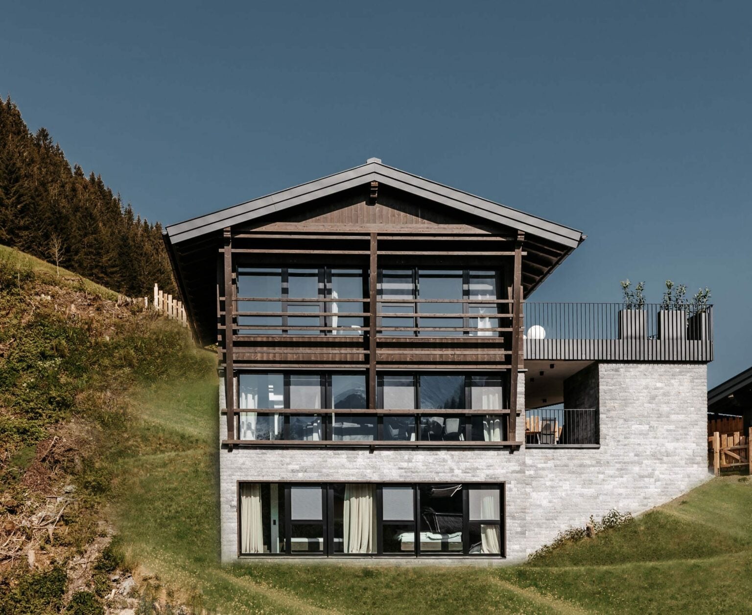 Das Chalet Hohe Tauern lässt Luxus und Heimatverbundenheit zu einem exklusiven Ganzen werden: Auf drei geschmackvoll eingerichteten Stockwerken stehen insgesamt drei Schlafzimmer inklusive privatem Badezimmer, ein ausgedehnter Wellness- und ein gemütlicher Wohnbereich zur Verfügung. Großzügige Glasfronten geben den Blick in die Berge frei und machen das Chalet gemeinsam mit angenehmen Naturmaterialien und durchdachten Details zu einem Kokon alpiner Gemütlichkeit.