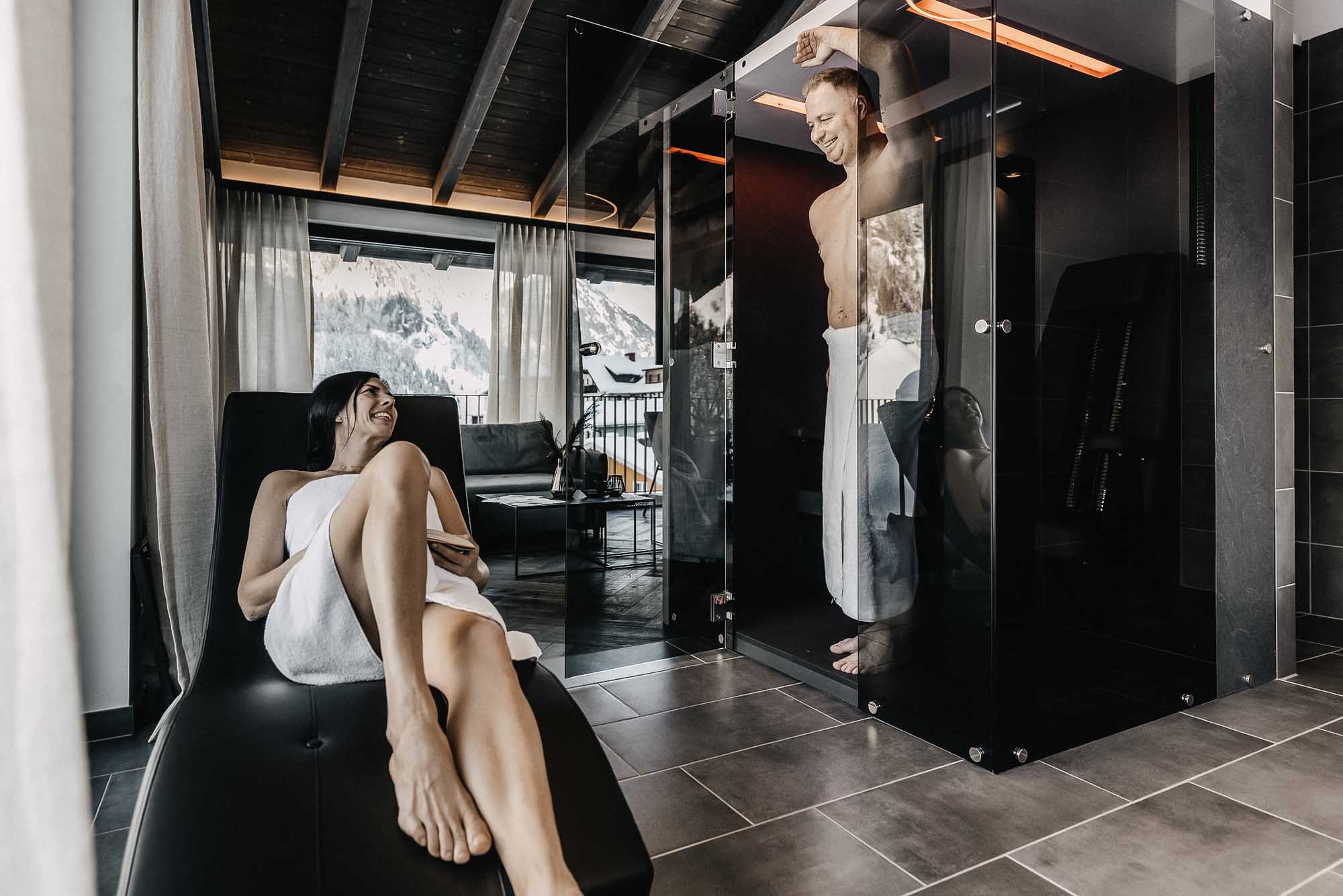 Entspannung ganz nach deiner eigenen Uhr und völlig unabhängig vom Wetter: Im privaten Wellnessbereich samt Infrarotkabine, freistehender Badewanne und stimmungsvollem Ruhebereich schaltest du ab. Daneben garantieren der Hot Tub mit Blick in die Bergwelt und die Außensauna samt Sonnenterrasse ein Wellnesserlebnis der besonderen Art – der ONKL XONNA Art eben.